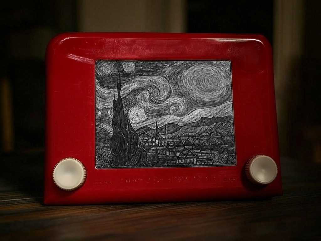 It is with a trembling hand and a heart both heavy and alight that I set down my thoughts upon this curious invention of modernity, this “Etch A Sketch,” as they call it—a toy, they say, though I find in it a mirror of my own torments and fleeting joys. I received this object, a rectangular frame of crimson plastic with a grey window at its heart, through the kindness of a friend who thought it might amuse me. Amuse! Ah, how little they know of the storms that rage within me when I confront a new means of expression, however humble it may seem.