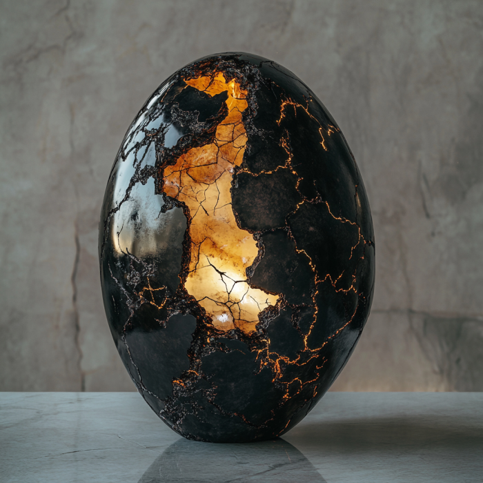 Finally, Stone no. IV—the egg-shaped one, the most polished, but no less haunting. It’s smooth, almost obsidian, with cracks radiating across its surface like veins of fire. The amber inside is brighter here, more expansive, as if it’s trying to break free. This is the future, I think—Ukraine reborn, maybe, or the hope of rebirth. But the cracks tell another story: nothing comes back whole after a war like this. Brancusi knows that. He’s seen too much to believe in easy redemption. The egg is a symbol of life, sure, but it’s also a reminder of fragility. One wrong move, and it shatters.