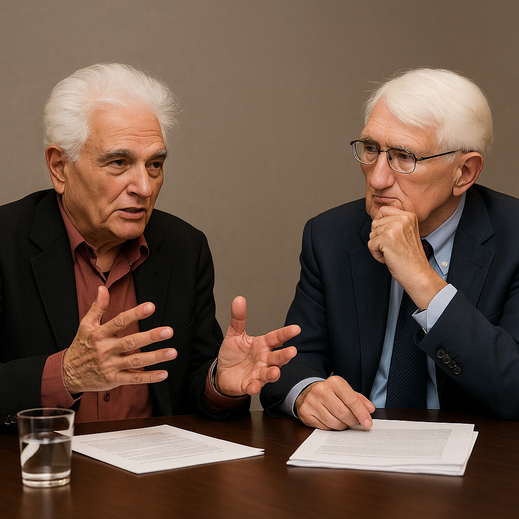 Let me be clear: I have never met Jürgen Habermas. Not truly. There have been instances, yes, of discourse attributed to that name, appearing in seminar rooms, footnotes, German television. But to “meet” requires presence, and presence, as we know, is the most dangerous metaphysical assumption of all (even, and especially, if we are supposedly talking of two supposed men supposedly debating at a supposed table within the spacetime continuum – an idea that so-called photographic evidence may supposedly promote). I suggest—gently, playfully, without malice—that Habermas may be a fiction. A product of the Enlightenment’s longing for the paternal voice. An ideologeme. A Normative Dad-bot conjured by Kant’s fever dream and maintained by the Frankfurt School’s endowment fund.